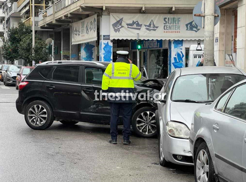 Σφοδρή σύγκρουση δύο Ι.Χ. αυτοκινήτων που προκάλεσε εν συνεχεία καραμπόλα σημειώθηκε το πρωί της Κυριακής στη συμβολή των οδών Ανθέων με Λασκαράτου, στην ανατολική Θεσσαλονίκη.