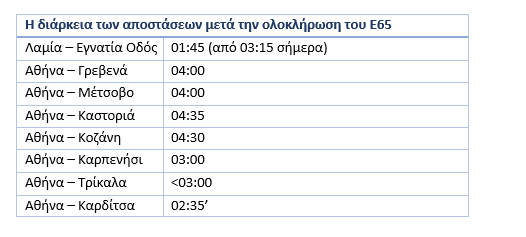 Τέλος, ιδιαίτερη αναφορά πρέπει να γίνει και στην αναπτυξιακή ώθηση που θα προσφέρει ο Ε65 σε πολλούς τουριστικούς προορισμούς της χώρα μας, που με την ολοκλήρωσή του θα είναι προσβάσιμοι, γρήγορα, εύκολα και με ασφάλεια. Ενδεικτικά αναφέρουμε ότι συνολικά το ταξίδι από Λαμία έως και Εγνατία Οδό, μέσω του Ε65 θα διαρκεί 1 ώρα και 45 λεπτά, από 3 ώρες και 15 λεπτά σήμερα.