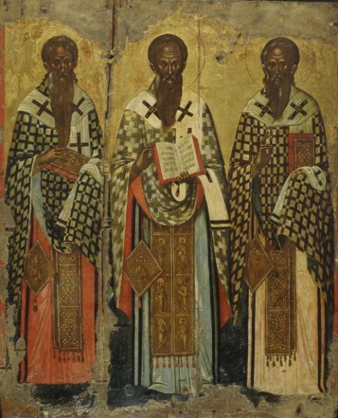 Οι Τρεις Ιεράρχες (φορητή εικόνα του τέλους του 16ου αιώνα διά χειρός Μιχαήλ Δαμασκηνού, πηγή: Βυζαντινό και Χριστιανικό Μουσείο)