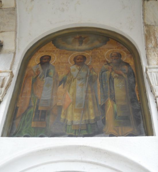 Οι Τρεις Ιεράρχες στο υπέρθυρο της εισόδου του ομώνυμου μητροπολιτικού ναού της Σκιάθου