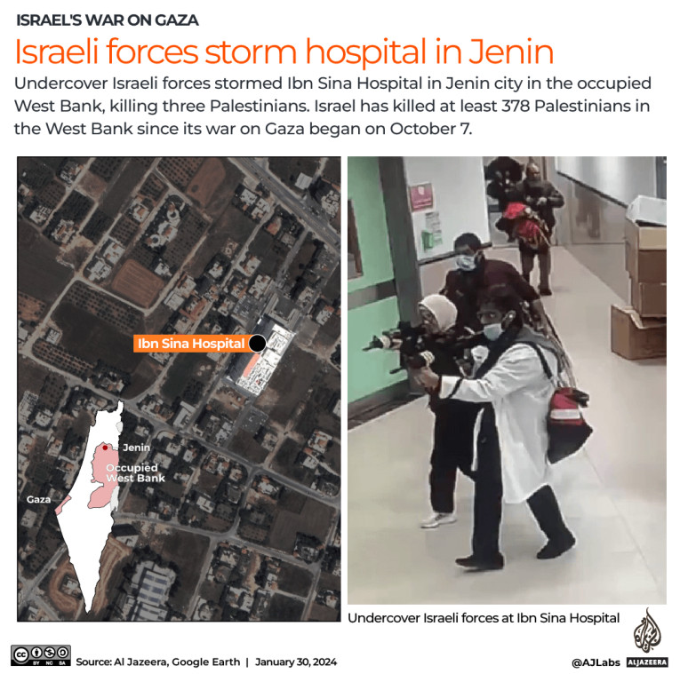 Σύμφωνα με το Al Jazeera Arabic, τρεις Παλαιστίνιοι σκοτώθηκαν μετά από εισβολή του ισραηλινού στρατού σε νοσοκομείο στην Τζενίν στη Δυτική Όχθη.