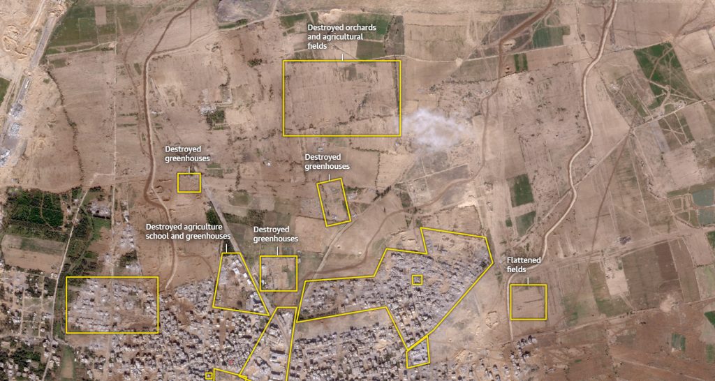 Η ανάλυση δείχνει επίσης εκτεταμένη καταστροφή καλλιεργήσιμων εκτάσεων και πολλαπλασιασμό των πόλεων με σκηνές κοντά στα σύνορα με την Αίγυπτο.