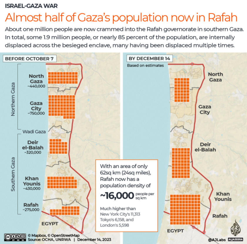 Η ισραηλινή επίθεση έχει αφήσει το 85% του πληθυσμού της Γάζας εσωτερικά εκτοπισμένο εν μέσω οξείας έλλειψης τροφίμων, καθαρού νερού και φαρμάκων, ενώ το 60% των υποδομών του θύλακα έχει υποστεί ζημιές ή έχει καταστραφεί, σύμφωνα με τον ΟΗΕ.