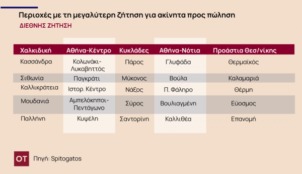 Εστιάζοντας στην περιοχή του κέντρου της Αθήνας, οι περιοχές που συγκέντρωσαν το μεγαλύτερο ενδιαφέρον είναι το Κολωνάκι-Λυκαβηττός, το Παγκράτι, το Ιστορικό κέντρο, η περιοχή Αμπελόκηποι-Πεντάγωνο και η Κυψέλη. Την πρωτιά στις Κυκλάδες παίρνει η Πάρος, σε ό,τι αφορά τη διεθνή ζήτηση ακινήτων προς πώληση το 2023, ενώ ακολούθησαν η Μύκονος, η Νάξος, η Σύρος και η Σαντορίνη.