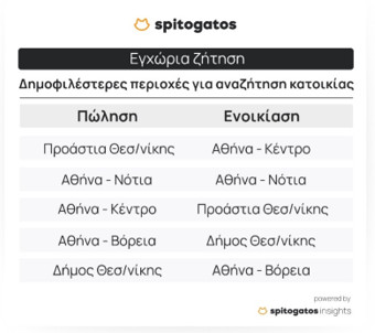 Οι πιο δημοφιλείς περιοχές για αναζήτηση κατοικίας προς ενοικίαση πανελλαδικά για το 2023 ήταν το κέντρο της πρωτεύουσας και τα Νότια Προάστιά της, ενώ ακολουθούν τα Προάστια της Θεσσαλονίκης, ο Δήμος Θεσσαλονίκης και τα Βόρεια Προάστια της Αθήνας.