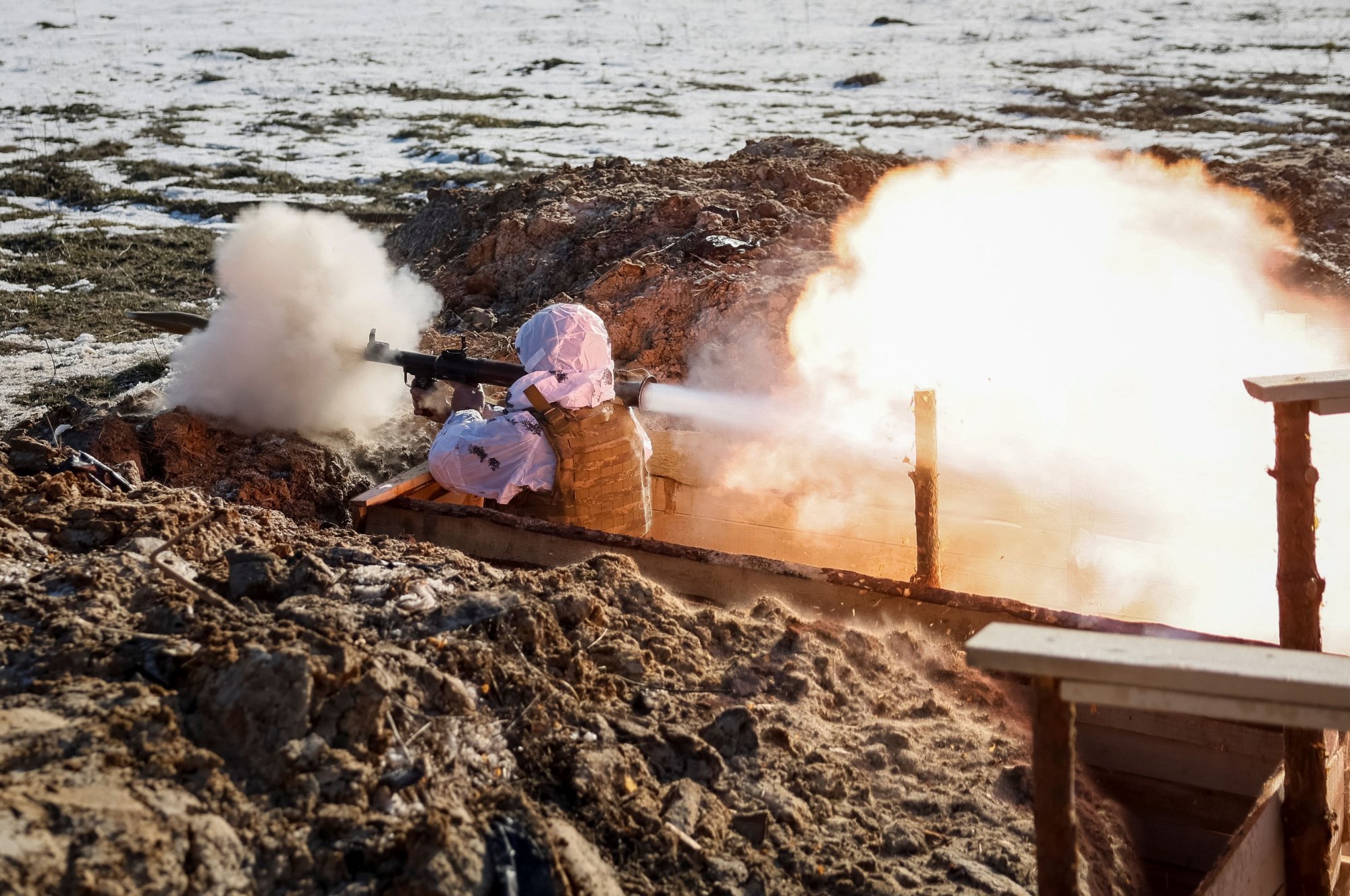 Ένας Ουκρανός στρατιώτης εκτοξεύει οβίδα με σύστημα RPG-7 κατά τη διάρκεια στρατιωτικών ασκήσεων, εν μέσω της επίθεσης της Ρωσίας στην Ουκρανία, στην περιοχή Zhytomyr, Ουκρανία, 30 Ιανουαρίου 2024. (REUTERS/Gleb Garanich)