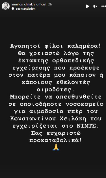 «Αγαπητοί φίλοι καλημέρα. Θα χρειαστώ λόγω της έκτακτης ορθοπεδικής εγχείρησης που προέκυψε στον πατέρα μου, κάποιον ή κάποιους εθελοντές αιμοδότες. Μπορείτε να απευθυνθείτε σε οποιδήποτε νοσοκομείο για αιμοδοσία υπέρ του Κωνσταντίνου Χειλάκη που εγχειρίζεται στο ΝΙΜΤΣ. Σας ευχαριστώ προκαταβολικά» έγραψε στην ανάρτησή του ο Αιμίλιος Χειλάκης.