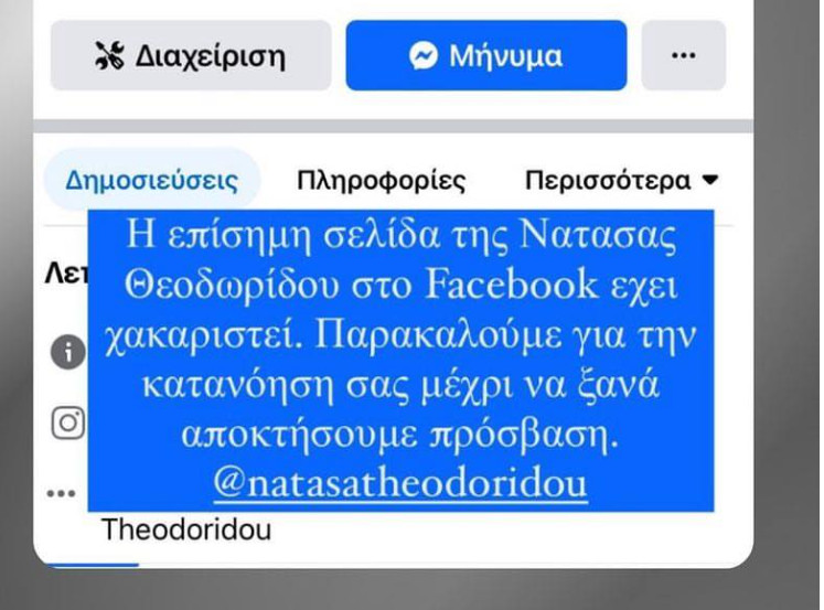 «Η επίσημη σελίδα της Νατάσας Θεοδωρίδου στο facebook έχει χακαριστεί. Παρακαλούμε για την κατανόησή σας μέχρι να ξαναποκτήσουμε πρόσβαση» ανέφερε η ανάρτηση στον λογαριασμό της Νατάσας Θεοδωρίδου στο Ιnstagram.