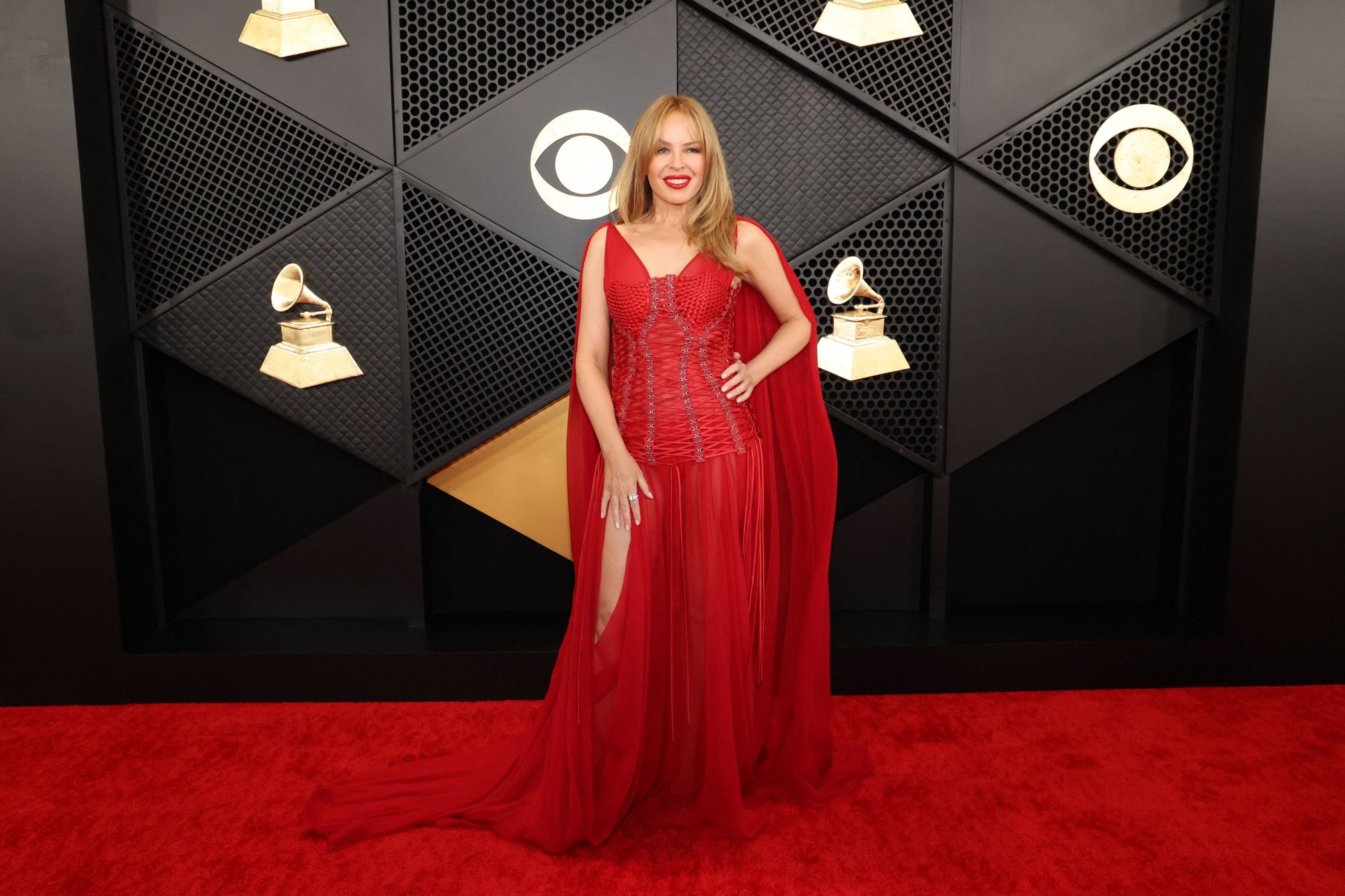 Η Αυστραλή τραγουδίστρια Kylie Minogue, η οποία κέρδισε Γραμμυ για την καλύτερη ποπ χορευτική ηχογράφηση, φόρεσε ένα κόκκινο φόρεμα Dolce & Gabbana με κορσέ από σατέν δαντελένια ύφανση, διπλή ουρά στον ώμο και κοσμήματα Martin Katz / Photo: Reuters