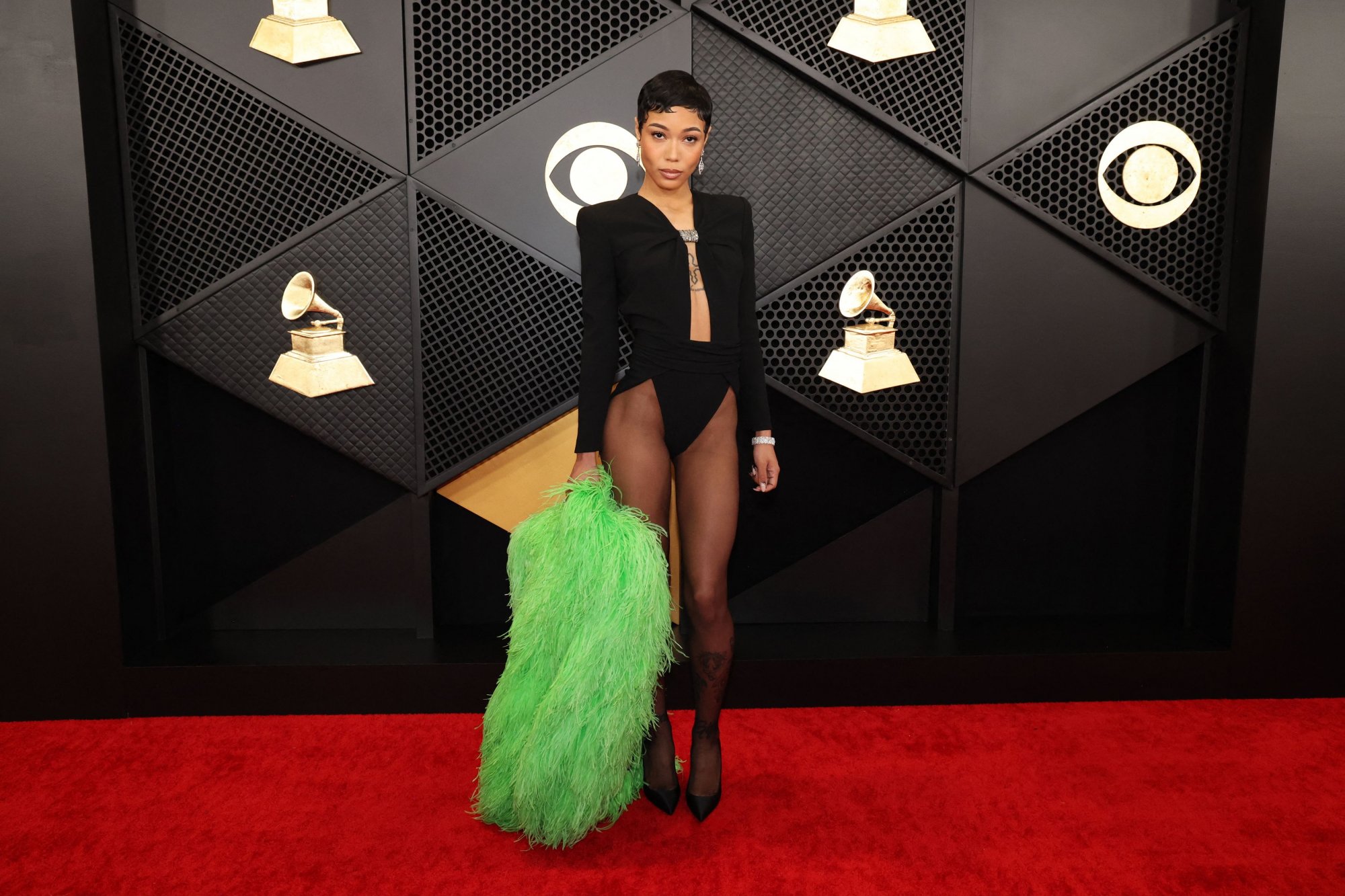 Η διπλά υποψήφια Coi Leray έμοιαζε σαν να είχε έρθει κατευθείαν από το Moulin Rouge, με το ντύσιμό της να δίνει μια νέα πινελιά στην τάση χωρίς παντελόνι με ένα φωτεινό πράσινο φτερωτό παλτό και το ρολόι και τα σκουλαρίκια Jacob & Co. / Photo: Reuters