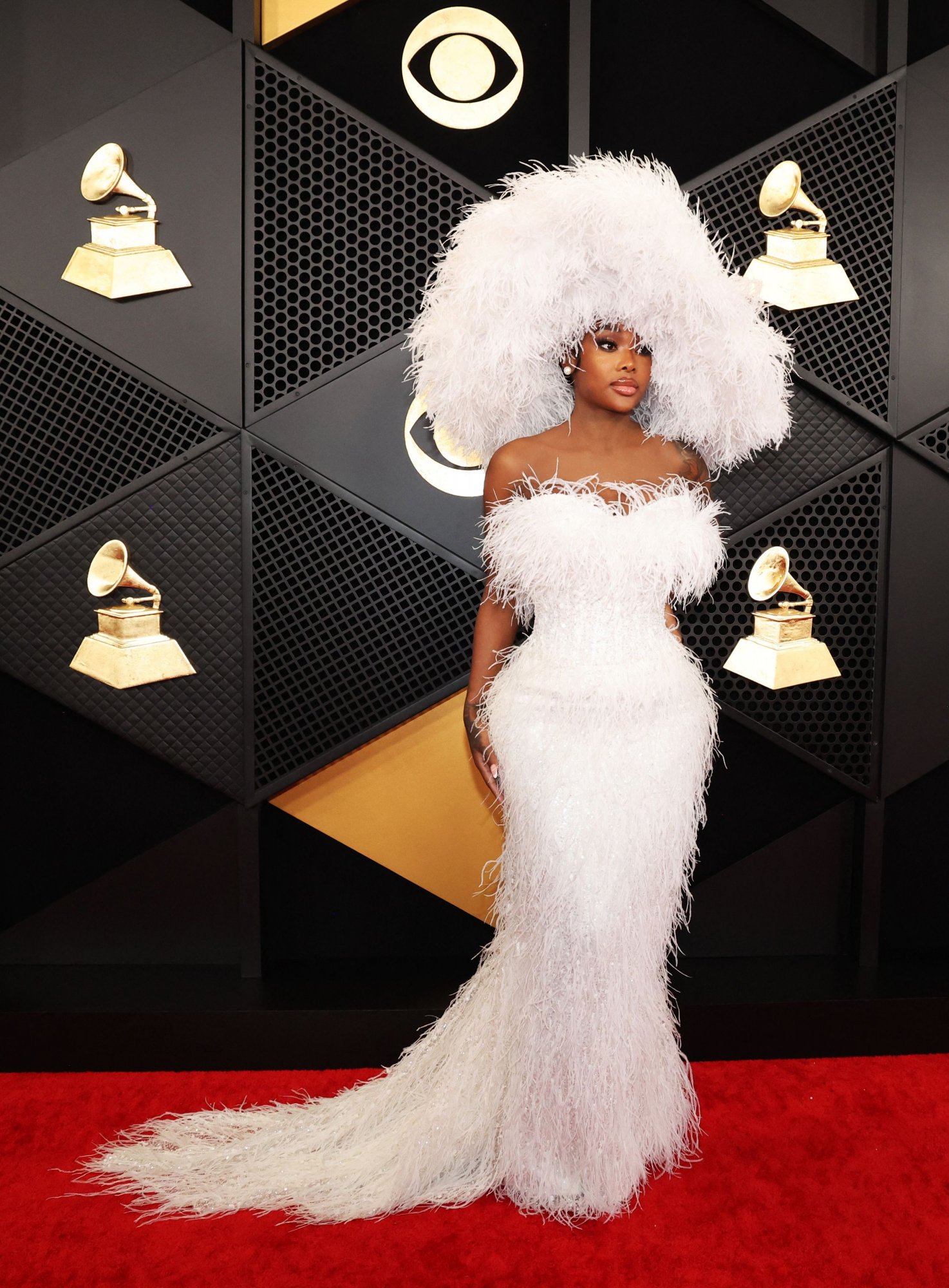 Η τραγουδίστρια Summer Walker, υποψήφια για το R&B άλμπουμ της «Clear 2: Soft Life», ήταν μια φτερωτή bonanza με λευκό φόρεμα και ασορτί υπερμεγέθες καπέλο / Photo: Reuters