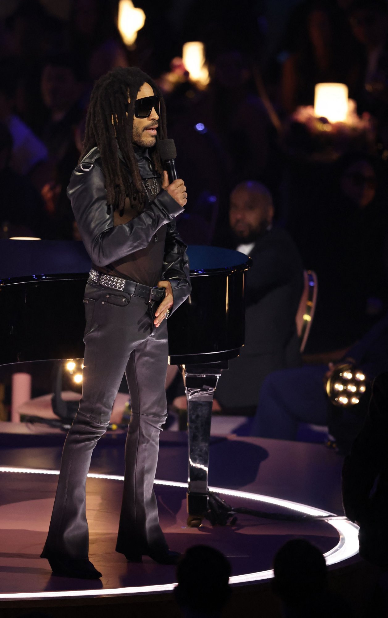 Ο Lenny Kravitz φόρεσε ένα δερμάτινο crop jacket, ένα διάφανο μαύρο μπλουζάκι και ένα παντελόνι συνδυασμένο με πολλά ασημένια κολιέ με σταυρούς / Photo: Reuters