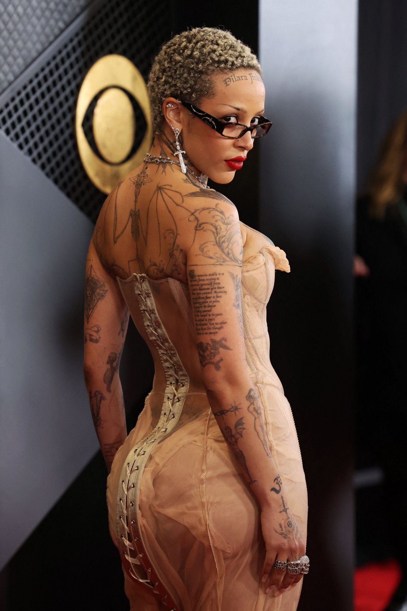 Η Miley Cyrus τράβηξε τα βλέμματα με ένα ογκώδες updo στα μαλλιά της και ένα outfit Maison Margiela που φαινόταν να είναι κατασκευασμένο εξ ολοκλήρου από χρυσές παραμάνες. Η τριπλά υποψήφια Doja Cat εν τω μεταξύ έφτασε με ένα εξίσου αποκαλυπτικό διάφανο φόρεμα της Τουρκοβρετανίδας σχεδιάστριας Dilara Findikoglu.