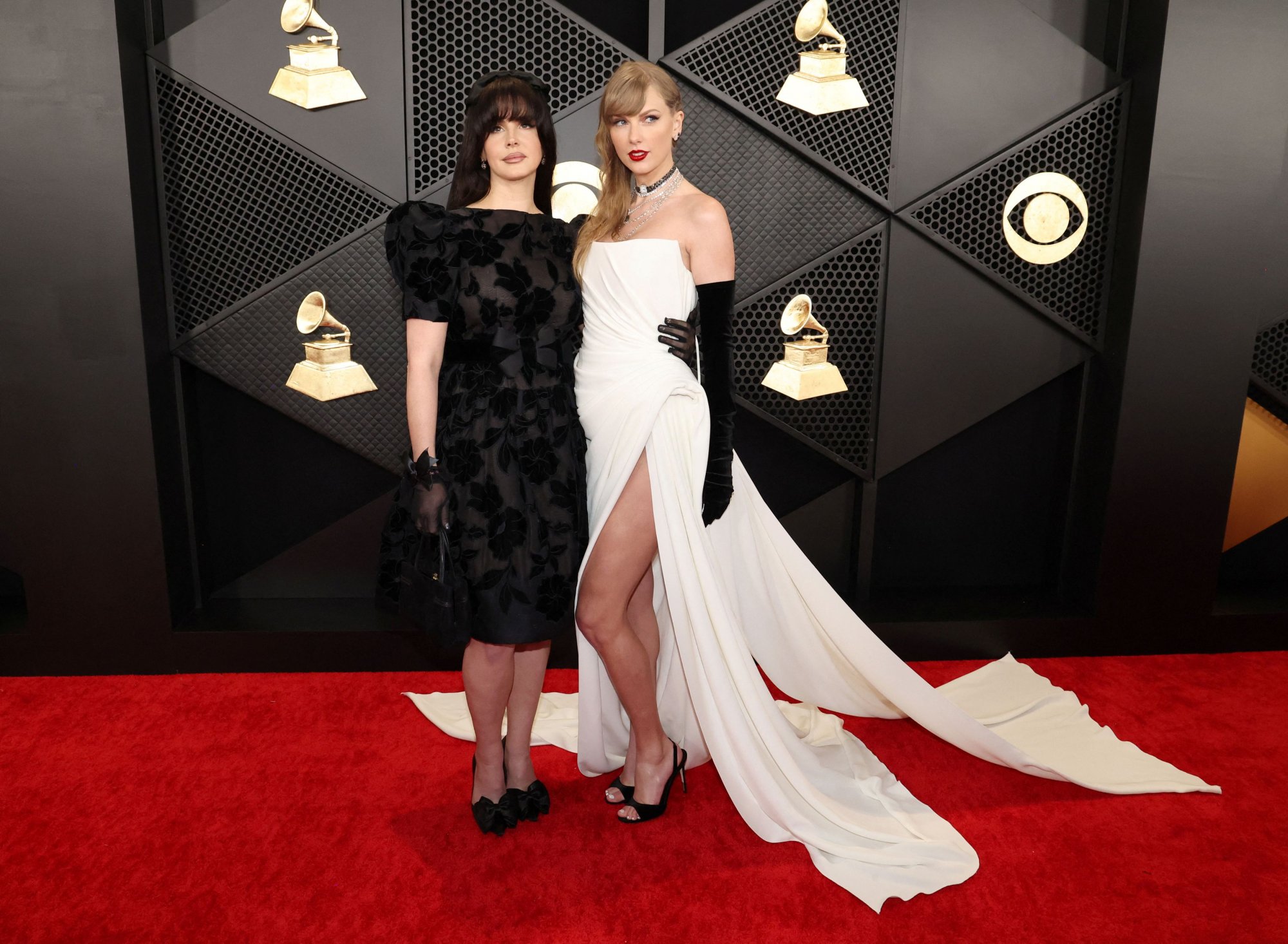 Η Τέιλορ Σουίφτ φτάνει φορώντας Schiaparelli Couture στα 66α βραβεία Grammy στο Λος Άντζελες, Καλιφόρνια αγκαλιά με τηn Λάνα Ντελ Ρέι, η οποία ορούσε ένα λουλουδάτο μαύρο φόρεμα με φουσκωτά μανίκια και κοσμήματα Fred Leighton / Photo: Reuters