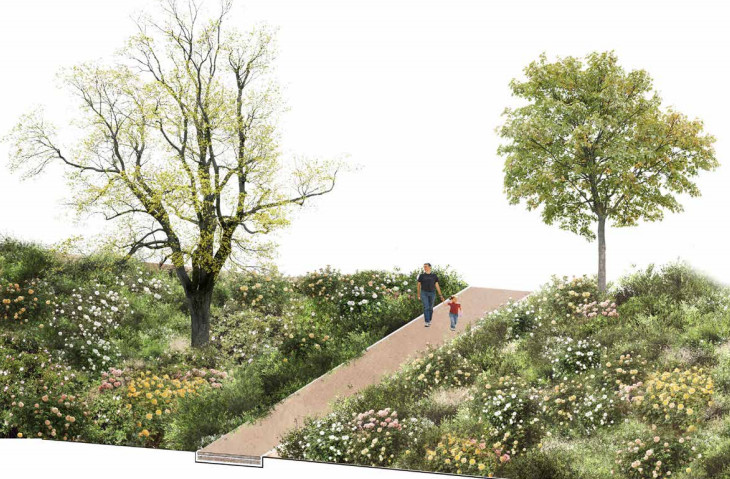 Η περιοχή επέμβασης της μελέτης περιλαμβάνει έκταση 34 στρεμμάτων και περιμέτρου 762 μέτρων. Ο ρόλος των δένδρων είναι πολύ σημαντικός στη σύνθεση του φυτικού υλικού. Φυτεύονται περίπου 450 δένδρα. Τα μονοπάτια ακολουθούν τις αρχικές χαράξεις, όπως αυτές εντοπίζονται από τα ίχνη της οριοθέτησής τους.