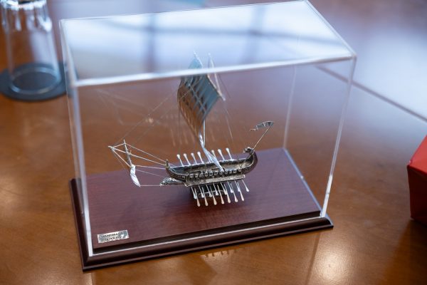 Στο τέλος της συνάντησης, ο κ. Μώραλης προσέφερε στον κ. Στυλιανίδη μια μινιατούρα αρχαίας τριήρους.