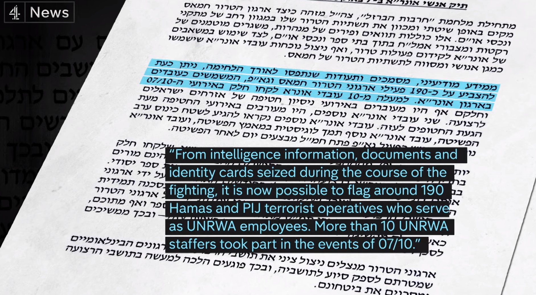 Το πρόγραμμα του Channel 4 ανέφερε ότι το Ισραήλ «δεν παρέχει κανένα στοιχείο για να στηρίξει τον εκρηκτικό νέο ισχυρισμό του ότι το προσωπικό της UNRWA συμμετείχε στις τρομοκρατικές επιθέσεις στο Ισραήλ» στο έγγραφο.