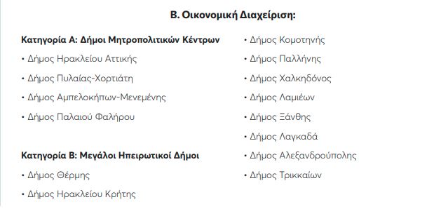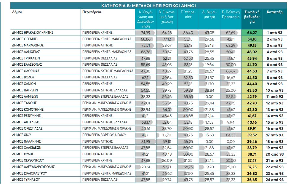 Στην κατηγορία αυτή συμμετείχαν 93 Μεγάλοι Δήμοι και στην πρώτη θέση είναι ο Δήμος Θέρμης με βαθμολογία 77,12 μονάδες στην δεύτερη θέση ο Δήμος Ηρακλείου Κρήτης με 64,25 μονάδες και στην τρίτη θέση ο Δήμος Κομοτηνής με 64,01 μονάδες.