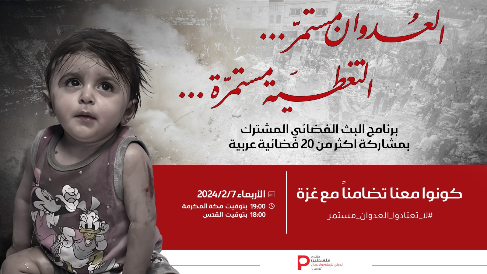 Το Διεθνές Παλαιστινιακό Φόρουμ για τα Μέσα Μαζικής Ενημέρωσης και Επικοινωνίας ανέφερε σε ανακοίνωσή του την Τρίτη ότι η κοινή εκπομπή έχει ως στόχο «να παροτρύνει το αραβικό κοινό για την ανάγκη να συνεχιστεί η νίκη, η αλληλεγγύη και η πίεση για να σταματήσει η επίθεση και η ανακούφιση της Γάζας και του λαού της».