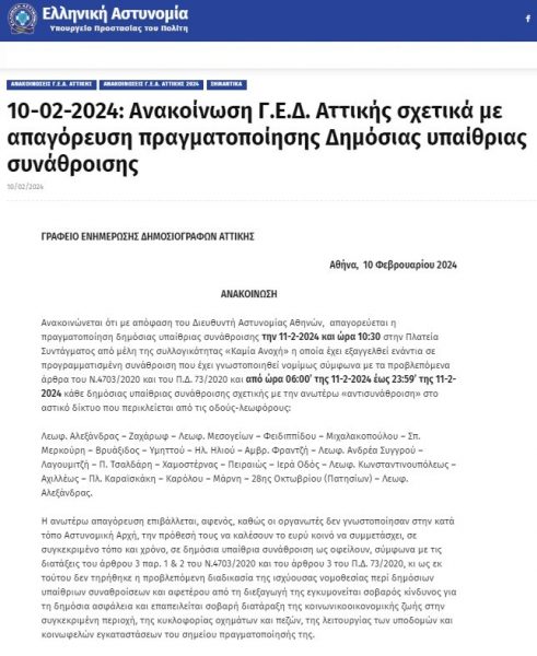 «Ανακοινώνεται ότι με απόφαση του Διευθυντή Αστυνομίας Αθηνών, απαγορεύεται η πραγματοποίηση δημόσιας υπαίθριας συνάθροισης την 11-2-2024 και ώρα 10:30 στην Πλατεία Συντάγματος από μέλη της συλλογικότητας «Καμία Ανοχή». Λίγες ώρες πριν την πραγματοποίηση της κινητοποίησης, κυβέρνηση και μπάτσοι απαγορεύουν την αντιφασιστική αντιομοφοβική συγκέντρωση που καλεί η τρανσφεμινιστική συλλογικότητα Καμία Ανοχή και μας απαγορεύουν και οποιαδήποτε άλλη συνάθροιση στο μισό λεκανοπέδιο, ενώ αναφέρουν πως επιτρέπουν την «προγραμματισμένη συνάθροιση που έχει γνωστοποιηθεί νομίμως.