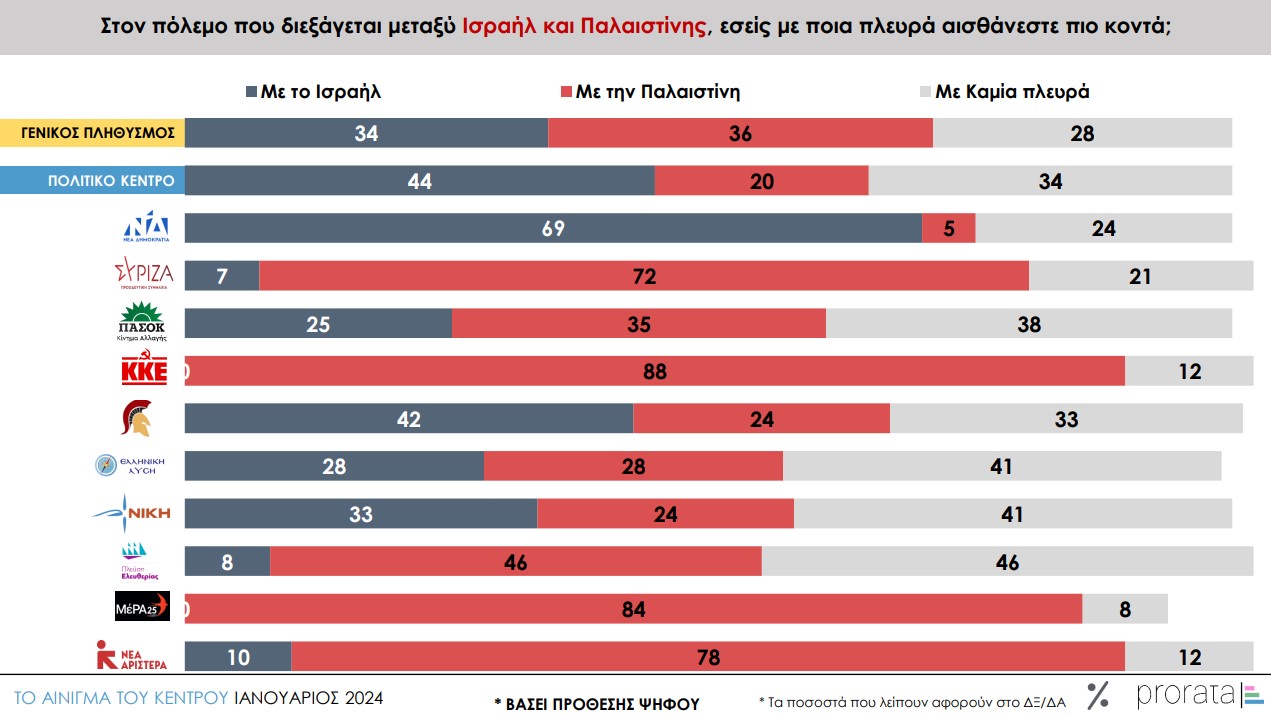 Αυτό όμως που έχει ίσως μεγαλύτερη σημασία, όπως φαίνεται από την έρευνα της Prorata είναι οι προτιμήσεις των Ελλήνων ψηφοφόρων, στο πλαίσιο των πολιτικών χώρων που δηλώνουν ότι εντάσσαονται. Από τους αριστερούς και το πολιτικό κέντρο μέχρι τους ακροδεξιούς. Ειδικά στο πολιτικό κέντρο ένα τεράστιο 44% αισθάνεται πιο κοντά στο Ισραήλ ενώ μόλις το 20% στους Παλαιστινίους. Ουδέτερο είναι το 34%.