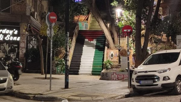 Στην οδό Καλλιδρομίου, σκαλιά διακοσμήθηκαν με την Παλαιστινιακή σημαία. Την εικόνα απαθανάτισε ο Moutaz Mahmoud.