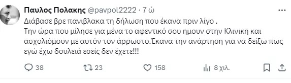 «Διάβασε βρε πανίβλακα τη δήλωση που έκανα πριν λίγο» ανταπάντησε ο κ. Πολάκης στον Υπουργό Υγείας, για να συμπληρώσει πως «την ώρα που μίλησε για μένα το αφεντικό σου ήμουν στην Κλινική και ασχολιόμουν με αυτόν τον άρρωστο. Έκανα την ανάρτηση για να δείξω πως εγώ έχω δουλειά εσείς δεν έχετε!!!».