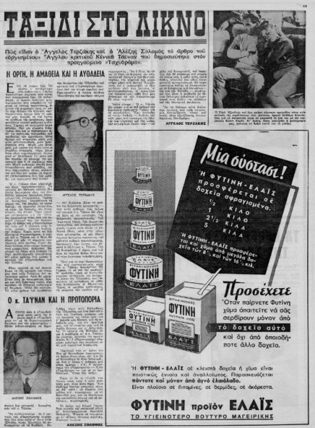 Στο τεύχος του «Ταχυδρόμου» που είχε κυκλοφορήσει στις 14 Ιουλίου 1962, ο Τερζάκης είχε κληθεί —μαζί με τον Αλέξη Σολομό— να σχολιάσει τις ταξιδιωτικές εντυπώσεις και τις γενικότερες απόψεις που είχε εκφράσει —σε κάθε άλλο παρά καλοπροαίρετο ύφος— στο αμέσως προηγούμενο τεύχος του περιοδικού (της 7ης Ιουλίου 1962) ο διάσημος άγγλος θεατρικός κριτικός και συγγραφέας Κένεθ Τάυναν (Kenneth Tynan, 1927-1980), ύστερα από μια σύντομη επίσκεψή του στη χώρα μας.