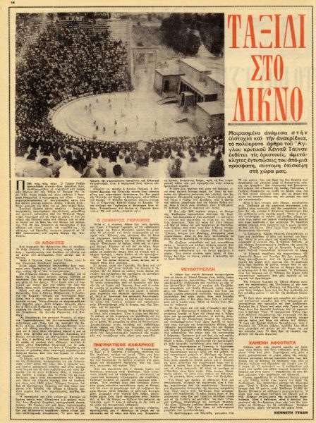 Ο κ. Τάυναν είναι «οργισμένος νέος» τριανταπεντάρης. Το γεγονός ότι εδήλωσε κάποτε ιδιότητα οργισμένου νέου, του επιβάλλει φαίνεται ορισμένες επαγγελματικές υποχρεώσεις. Πρέπει να διατηρήσει οπωσδήποτε τη φόρμα του. Να ενοχλεί, να σκανδαλίζει, να προκαλεί επεισόδια, να κάνει τον δύσκολο, τον απλησίαστο, τον στυφό. Τώρα πιάνει και αποφαίνεται για την Ελλάδα, οχυρωμένος πίσω από την τεχνητή υπεροχή που του εξασφαλίζει το βάθρο του «Ομπσέρβερ» αφ’ ενός και η γλώσσα στην οποία γράφει, γλώσσα διεθνής, αφ’ ετέρου. Χωρίς αυτά τα δύο εξωτερικά πλεονεκτήματα η γνώμη του κ. Τάυναν και ο ίδιος θα είχαν για μας τη σημασία κεντήματος από σκνίπα. Γιατί βέβαια κανένας στον κόσμο πραγματικά μορφωμένος άνθρωπος δεν μπορεί να πάρει στα σοβαρά τα περί «καλλιτεχνικής στειρότητος επί χίλια χρόνια» που γράφει ο κριτικός του «Ομπσέρβερ» για την Ελλάδα.
