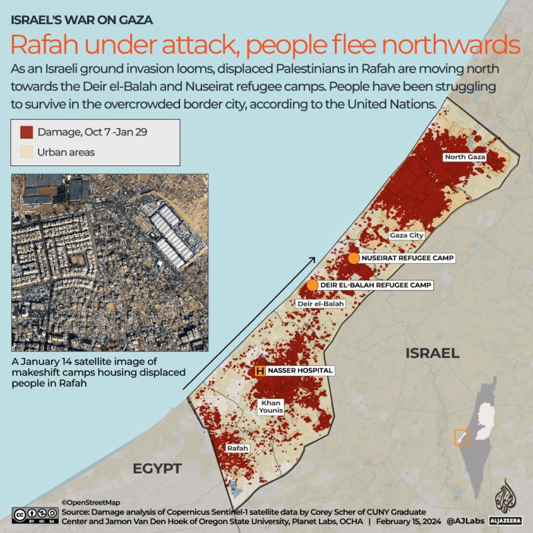 Υπολογίζεται ότι 1,4 εκατομμύρια Παλαιστίνιοι, περισσότεροι από τους μισούς κατοίκους της Γάζας, έχουν συνωστιστεί στη Ράφα, οι περισσότεροι από τους οποίους έχουν εκτοπιστεί από τις μάχες σε άλλα σημεία της περιοχής. Εκατοντάδες χιλιάδες ζουν σε εκτεταμένους καταυλισμούς με σκηνές.