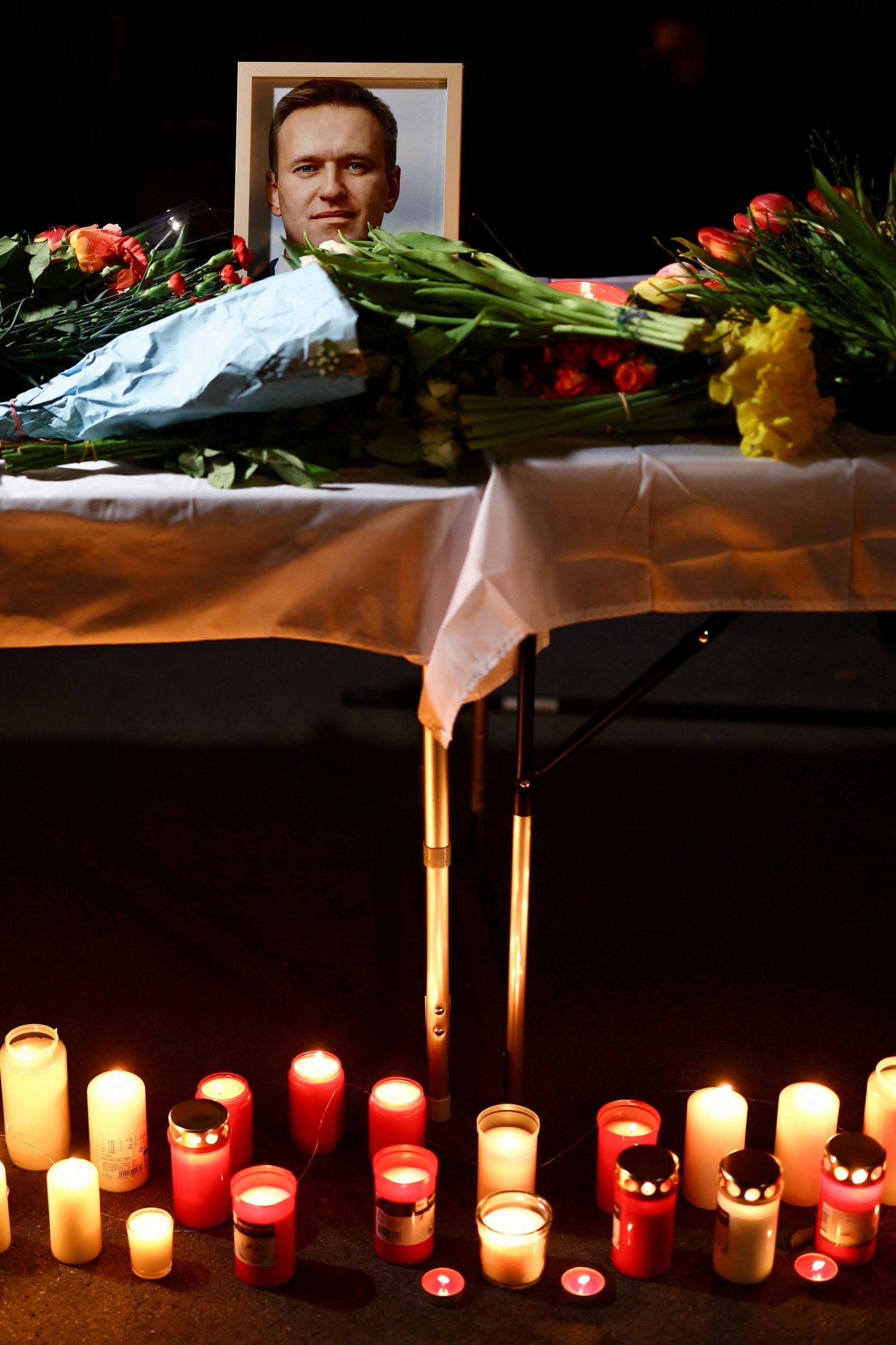 Το αυτοσχέδιο μνημείο απεικονίζεται καθώς οι άνθρωποι παρακολουθούν μια αγρυπνία στη μνήμη του Ναβάλνι μπροστά από το ρωσικό προξενείο στην πλατεία Europa, στο Μόναχο, 16 Φεβρουαρίου 2024 (REUTERS).