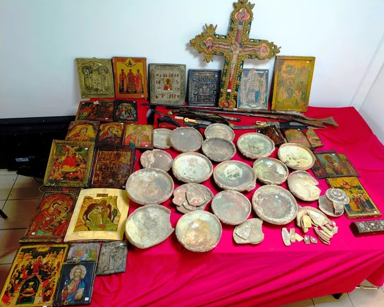 Επίσης εντοπίστηκαν και κατασχέθηκαν 24 θρησκευτικές εικόνες, σταυρός τέμπλου μεταβυζαντινών χρόνων και δύο μεταλλικοί σταυροί, τα οποία σύμφωνα με γνωμάτευση αρμόδιας αρχαιολόγου της Εφορείας Αρχαιοτήτων Θεσσαλονίκης εμπίπτουν στις προστατευτικές διατάξεις του Νόμου που αφορά σε «Κύρωση κώδικα νομοθεσίας για την προστασία των αρχαιοτήτων και εν γένει της πολιτιστικής κληρονομιάς», καθώς και 12 μεταλλικές πόρπες, οκτώ μεταλλικά αντικείμενα, ένα φλουρί και ένα γιαταγάνι, τα οποία είναι λαογραφικού ενδιαφέροντος και θα αποδοθούν στο αρμόδιο μουσείο για εκτίμηση και περαιτέρω διερεύνηση.