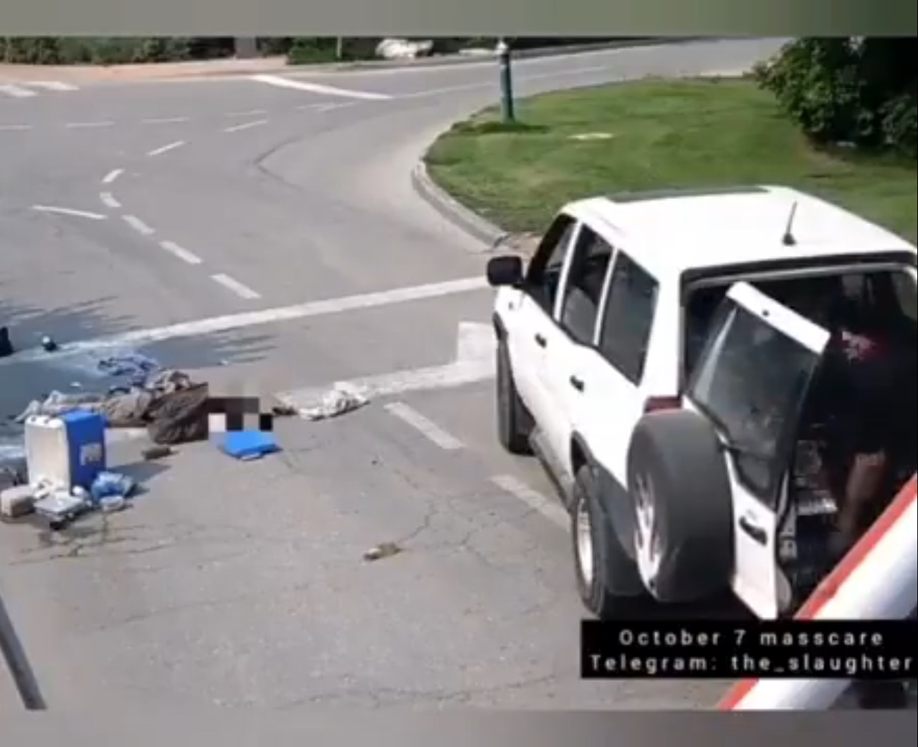 Μαζί κουβαλούν έναν από τους άντρες που κοίτονται στο δρόμο πιάνοντας τον από τα χέρια και τα πόδια και τον βάζουν στο πορτμπαγκάζ του SUV. Στη συνέχεια, οι δυο τους κοιτάζουν για λίγο σκόρπια αντικείμενα πριν φύγουν από το κιμπούτς οδηγώντας το όχημα με την όπισθεν. Ένα στιγμιότυπο του βίντεο αναρτήθηκε στο X από έναν εκπρόσωπο του ισραηλινού στρατού και ένα απόσπασμά του δημοσιεύτηκε από έναν αξιωματούχο του υπουργείου Εξωτερικών. Το βίντεο αναδημοσιεύεται στο τέλος του άρθρου.