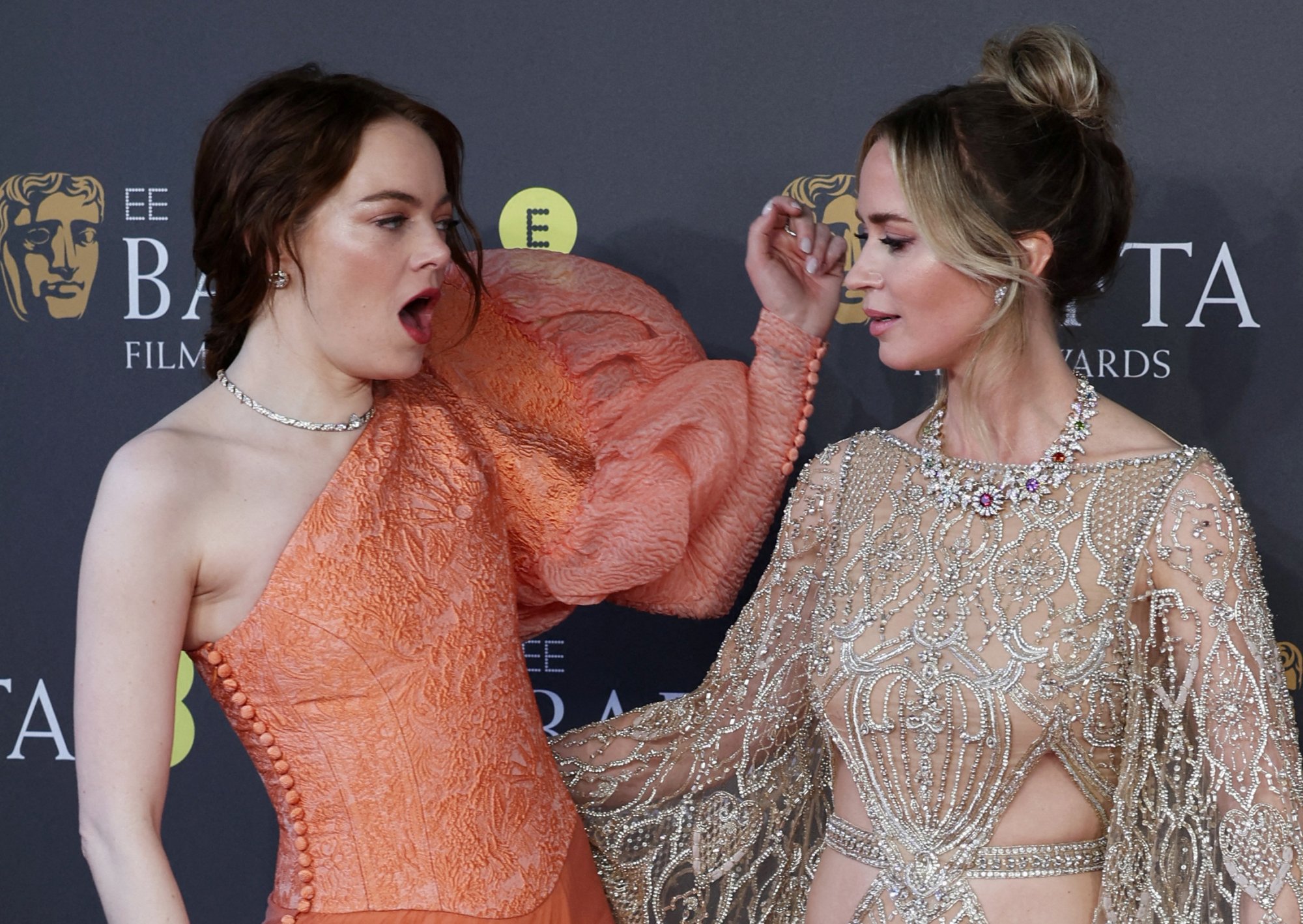 H Stone φόρεσε ένα πορτοκαλί φόρεμα σε στυλ «Poor Things» από τον οίκο Louis Vuitton και η Blunt ένα διάφανο φόρεμα