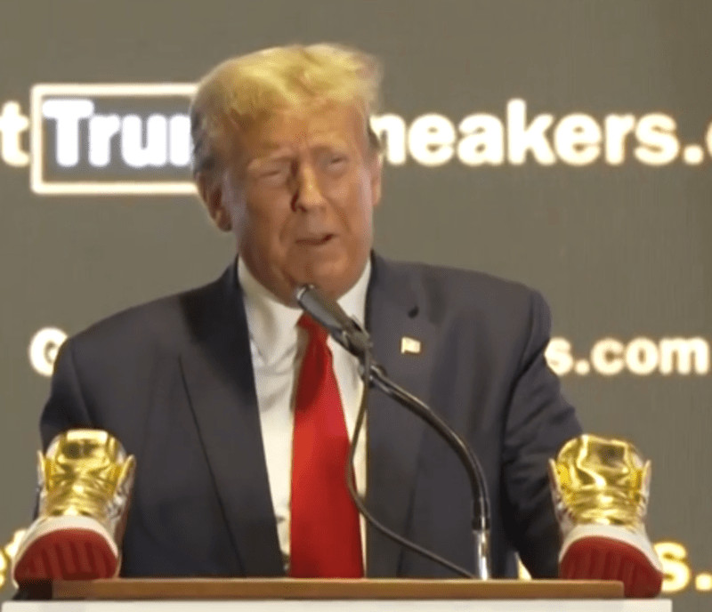Συγκεκριμένα, σύμφωνα με το CNN, ο πρώην πρόεδρος παρουσίασε τα «Trump Sneakers» στο Sneaker Con στη Φιλαδέλφεια. Τοποθέτησε ένα ζευγάρι χρυσά αθλητικά παπούτσια, τα οποία ένας νέος δικτυακός τόπος έχει καταχωρήσει στην τιμή των 399 δολαρίων και τα ονόμασε «NEVER SURRENDER HIGH-TOP SNEAKER», στο βήμα καθώς μιλούσε.