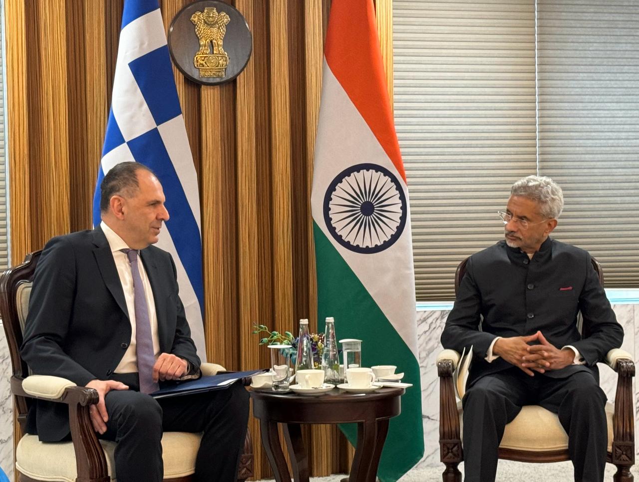 FM George Gerapetritis w/ #India counterpart @DrSJaishankar in New Delhi. Discussions focused on bilateral ties ahead of the upcoming state visit of the Greek PM to India and on the IMEC corridor as a bridge bringing together India & Europe. pic.twitter.com/ERku92bX8d