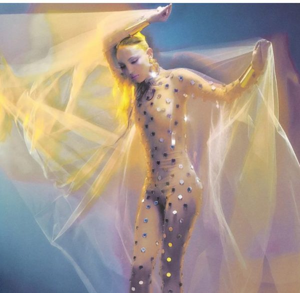 Σύμφωνα με την Daily Mail, για το εντυπωσιακό εξώφυλλο του διάσημου περιοδικού το μοντέλο φοράει ένα ασημένιο κορμάκι με κρόσσια με παστέλ μεταλλικές αποχρώσεις στο μακιγιάζ.