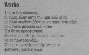 — Αν χρειαζόταν να μπει ένας υπότιτλος στα καινούργια αυτά ποιήματά σας, που να χαρακτηρίζει κάπως τη διάθεσή σας απέναντί τους, ποιος θα ήταν;