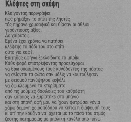 Και να μην το έχω πει, δεν μου είναι ξένο. Αλήθεια είναι ότι νοιάζομαι γι’ αυτούς τους αφανείς ήρωες. Αυτά κρατάει ως ομήρους το ουσιώδες, τα ακινητοποιεί με εκείνο το γνωστό κεφαλοκλείδωμα προφυλάσσοντας το στέρνο του, απειλεί ότι θα τα πυροβολήσει, κινείται κρυμμένο ασφαλές πίσω τους, τα σέρνει μαζί του έως ότου διαφύγει ασύλληπτο.