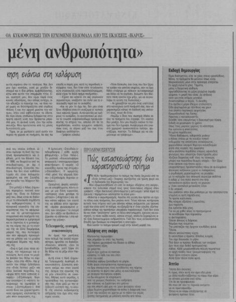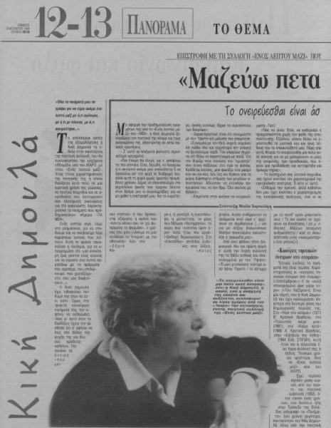 *Συνέντευξη που είχε παραχωρήσει η Κική Δημουλά στη δημοσιογράφο Μικέλα Χαρτουλάρη το φθινόπωρο του 1998, λίγες ημέρες πριν από την έκδοση της ποιητικής συλλογής της «Ενός λεπτού μαζί» (Ίκαρος). Είχε δημοσιευτεί στο φύλλο των «Νέων» που είχε κυκλοφορήσει το Σάββατο 3 Οκτωβρίου 1998.