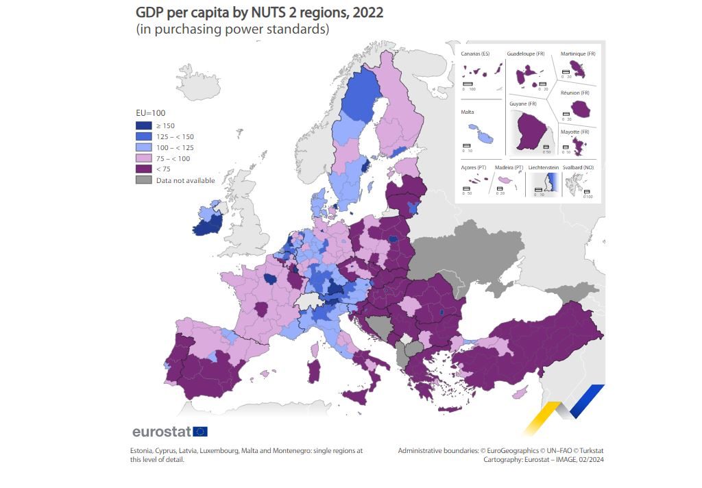 Συγκεκριμένα, το 2022 το κατά κεφαλήν ΑΕΠ εκπεφρασμένο σε μονάδες αγοραστικής δύναμης (PPS) στις περιφέρειες της ΕΕ κυμάνθηκε από 40% του μέσου όρου της ΕΕ στο Σεβεροζαπάντεν της Βουλγαρίας, έως 286% στη Νότια Ιρλανδία.