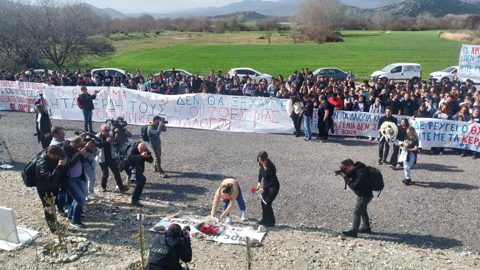Μήνυμα ότι «το έγκλημα στα Τέμπη δεν θα ξεχαστεί», στέλνουν φοιτητές που σήμερα συγκεντρώθηκαν στον τόπο της τραγωδίας, (εικόνα πάνω από 902.gr) με αφορμή τη συμπλήρωση ενός χρόνου από την σύγκρουση των τρένων, που στοίχισε τη ζωή σε 57 ανθρώπους -ανάμεσα τους φοιτητές.