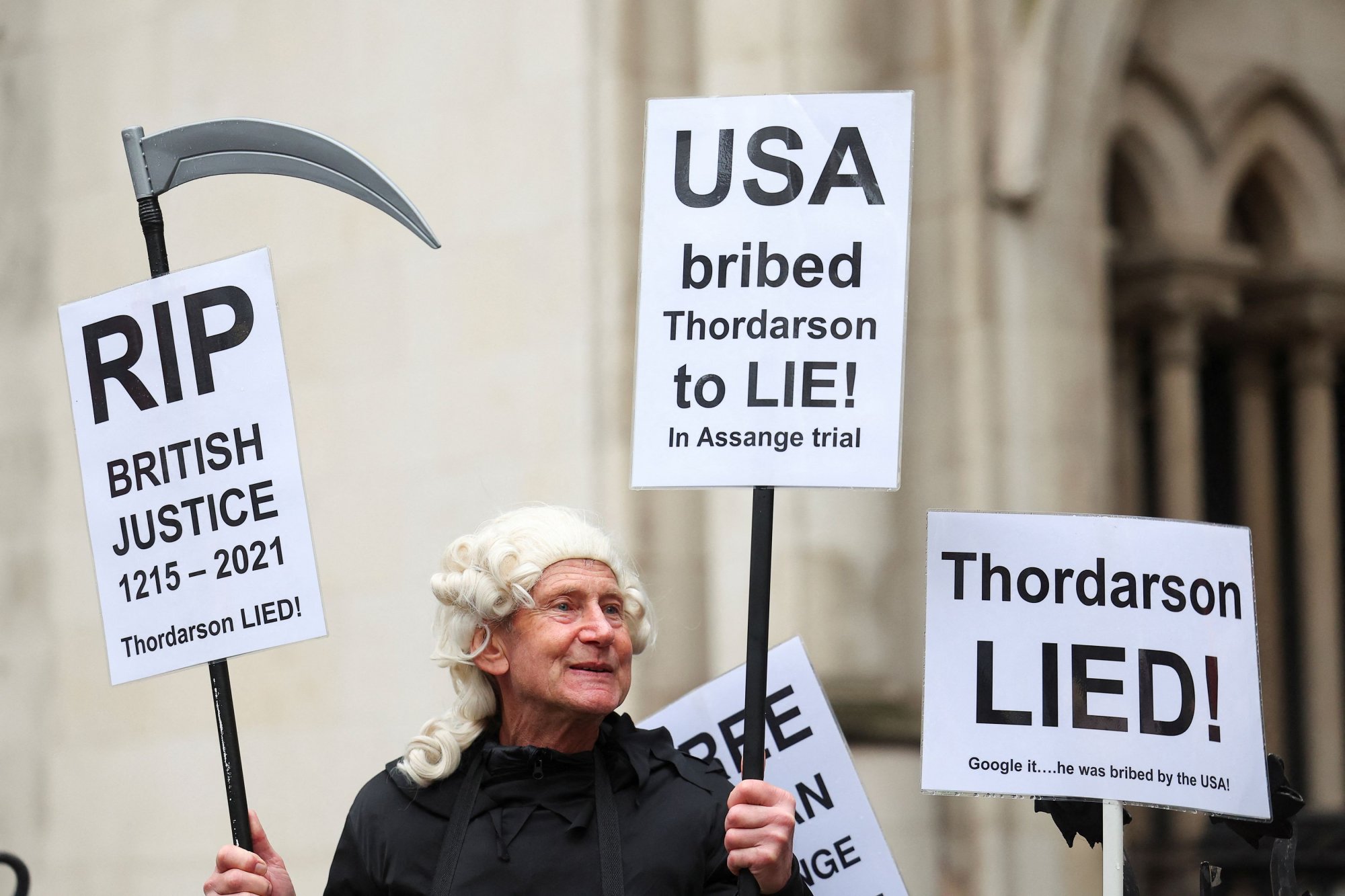 Υποστηρικτές του Τζούλιαν Ασάνζ έξω από το ανώτατο δικαστήριο στο Λονδίνο που δικάζεται η υπόθεση του δημοσιογράφου, 21 Φεβρουαρίου 2024 (REUTERS/Toby Melville).