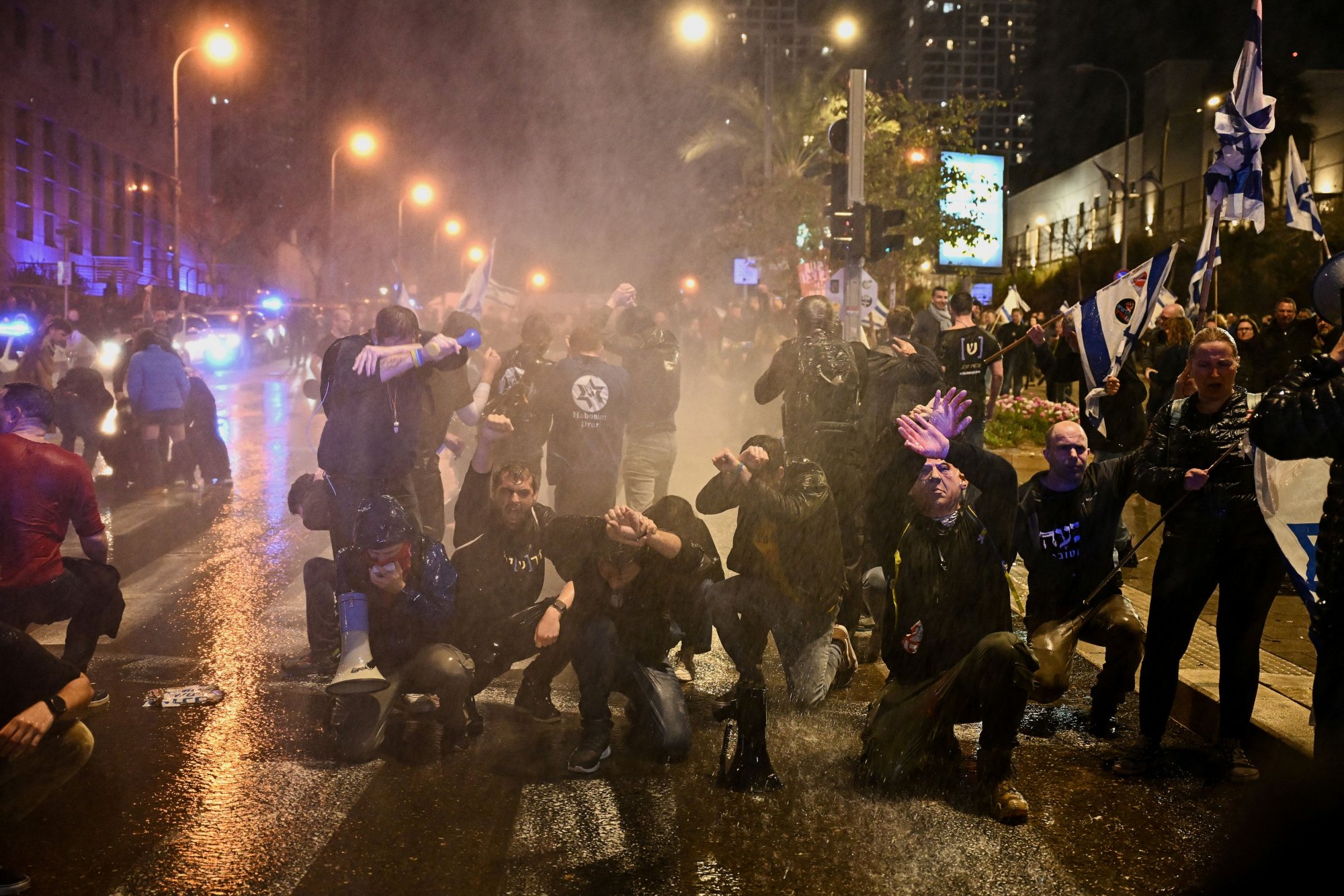 Οι αστυνομικές δυνάμεις στο Τελ Αβίβ άρχισαν να χρησιμοποιούν αύρες νερού για να διαλύσουν τους διαδηλωτές που στέκονταν στο πεζοδρόμιο της οδού Καπλάν εντός των νόμιμων ορίων της διαμαρτυρίας.