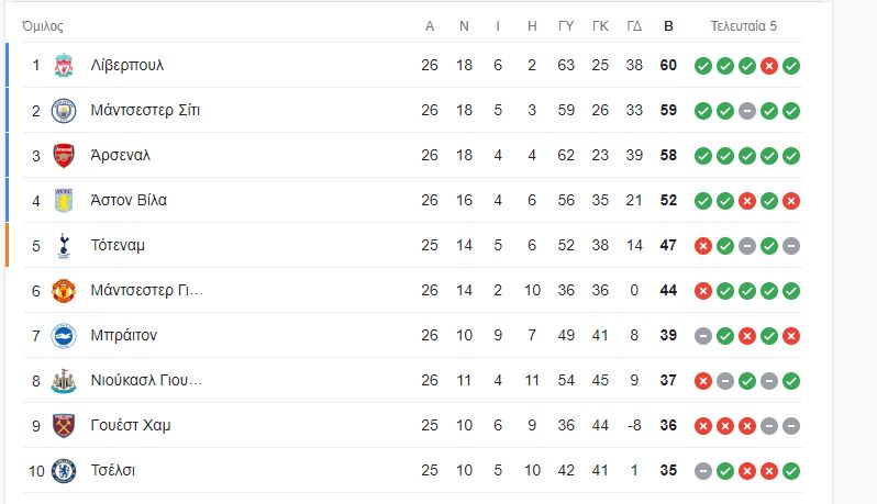Η ομάδα του Γιούργκεν Κλοπ έχει 60 βαθμούς, ενώ ακολουθούν οι «πολίτες» με 59 και ο σύλλογος του βόρειου Λονδίνου με 58. Πιο πίσω είναι η εξαιρετική Άστον Βίλα με 52, αλλά δεν μοιάζει να έχει ελπίδες. Αυτή είναι η αλήθεια, αφού οι τρεις είναι μια ταχύτητα πάνω από τους υπόλοιπους.