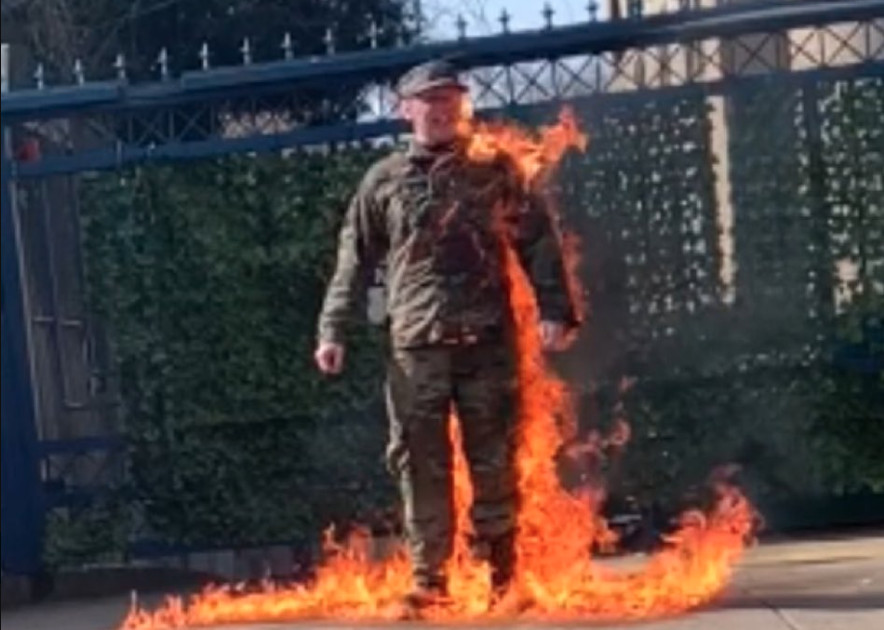 A man in uniform who described himself as an active duty member of the US military self-immolates outsides the Israeli Embassy in Washington DC in protest of the genocide in Gaza.