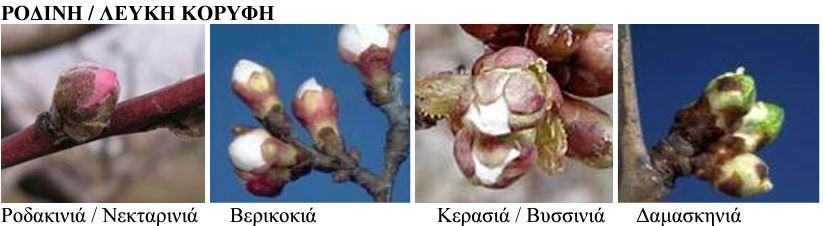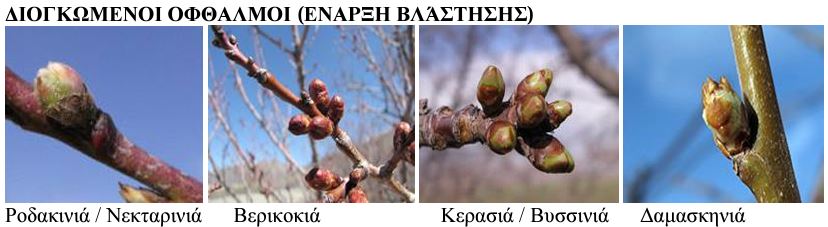 Όπως επισημαίνει το Περιφερειακό Κέντρο Βόλου, Προστασίας Φυτών, Ποιοτικού και Φυτοϋγειονομικού Ελέγχου, την περίοδο αυτή και ανάλογα με την περιοχή, μόνο ορισμένες πρώιμες ποικιλίες βερικοκιάς, ροδακινιάς και δαμασκηνιάς βρίσκονται στο στάδιο των διογκωμένων οφθαλμών (φουσκωμένα μάτια) και στη λευκή / ρόδινη κορυφή.