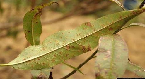 Σύμπτωμα σκωρίασης σε φύλλα ροδακινιάς.