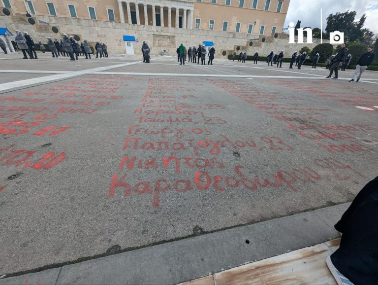 14:10 Διαδηλωτές γράφουν τα ονόματα των θυμάτων έξω από τη Βουλή