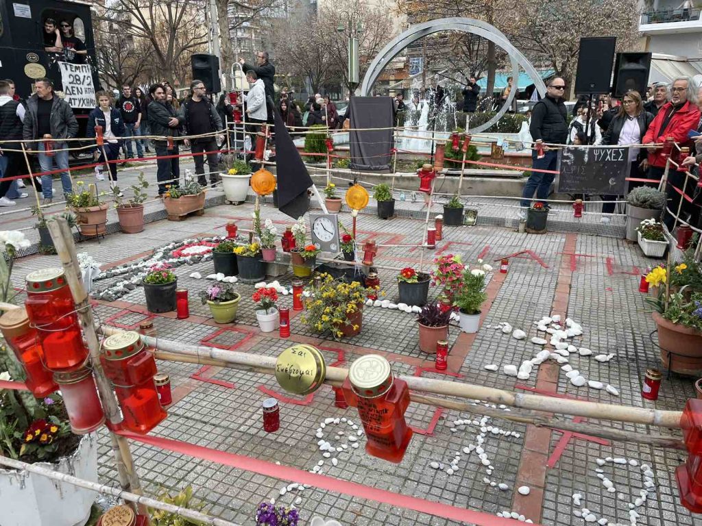 Θρήνος και τα αναπάντητα «γιατί» για το έγκλημα που οδήγησε στον θάνατο δεκάδες ψυχές. Αποκαλύφθηκε το μνημείο στην πλατεία του ΟΣΕ στη Λάρισα.